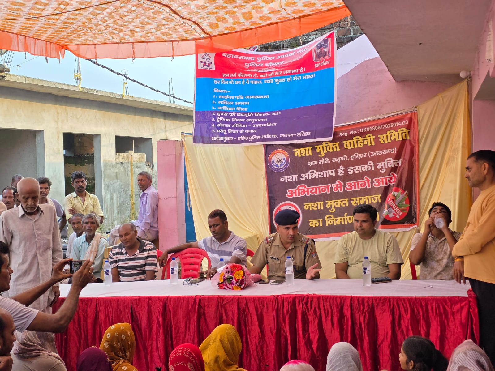 बहादराबाद (आर सी / संदीप कुमार) माननीय मुख्यमंत्री उत्तराखंड के “ड्रग्स फ्री देवभूमि मिशन 2025” और “नशा मुक्त शहर-नशा मुक्त गांव” अभियान को सफल बनाने के उद्देश्य से, शनिवार को थाना बहादराबाद पुलिस द्वारा ग्राम भौंरी में एक चौपाल कार्यक्रम का आयोजन किया गया।
