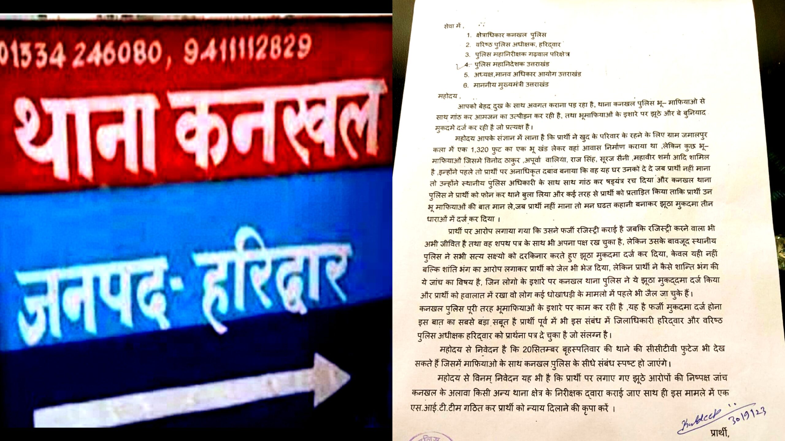 हरिद्वार (आर सी)। कनखल के एक युवक ने उसपर हुए मुकदमें के खिलाफ उच्च स्तरीय जांच की मांग मुख्यमंत्री, मानवाधिकार आयोग सहित सूबे के पुलिस मुखिया से लगाई है। युवक ने खुद के खिलाफ हुए झूठे मुकदमें का आरोप लगाते हुए व चालान के खिलाफ उच्च स्तरीय जांच की मांग और जांच अधिकारी बदलने की मांग के साथ साथ दोषी पुलिस अधिकारियों और भू माफियाओं के खिलाफ कड़ी कार्रवाई की मांग को लेकर जगजीतपुर निवासी कुलदीप सिंह ने सूबे के पुलिस मुखिया डीजीपी अशोक कुमार से गुहार लगाई है, डीजीपी के साथ- साथ कुलदीप सिंह ने राज्य मानवाधिकार आयोग और मुख्यमंत्री को भी पत्र देकर न्याय की गुहार लगाई है। पत्र में कुलदीप सिंह ने आरोप लगाते हुए बताया कि थाना कनखल पुलिस भू-माफियाओ से सांठ-गांठ कर आमजन का उत्पीड़न कर रही है, तथा भू-माफियाओं के इशारे पर झूठे और बे बुनियाद मुकदमे दर्ज कर रही है जो प्रत्यक्ष है। उन्होंने बताया कि खुद के परिवार के रहने के लिए ग्राम जमालपुर कला में एक 1,320 फुट का एक भू खंड लेकर वहां आवास निर्माण कराया था, लेकिन कुछ भू-माफियाओं जिसमे विनोद ठाकुर, अपूर्वा, वालिया, राज सिंह, सूरज सैनी, महावीर शर्मा आदि शामिल है।