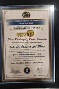 इस प्रतिष्ठित समारोह में जनपद उत्तरकाशी के डॉ. चंद्र लाल भारती को उनके सामाजिक कार्यों और मानवाधिकारों के संरक्षण के प्रति अटूट समर्पण के लिए ‘ह्यूमन राइट्स एंड दलित अपलिफ्टमेंट लीडरशिप’ राष्ट्रीय अवार्ड 2026 से नवाजा गया। डॉ. भारती वर्तमान में ‘ह्यूमन राइट्स ऑफ यूनाइटेड नेशन’ के सक्रिय सदस्य के रूप में कार्यरत हैं और लंबे समय से दलित उत्थान व मानवाधिकारों के लिए जमीनी स्तर पर संघर्ष कर रहे हैं। समाज के प्रति उनकी सेवाओं को देखते हुए उन्हें ‘भारत राष्ट्रीय श्री रत्न पुरस्कार 2026’ से भी सम्मानित किया गया है।